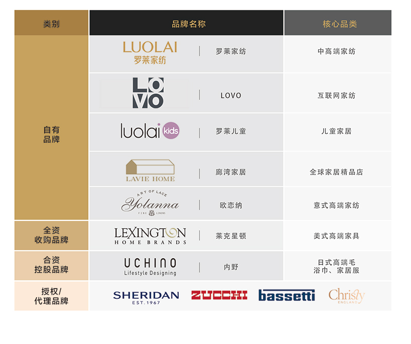 目前,公司拥有罗莱家纺、LOVO等自有品牌及收购、代理品牌共约20个,终端销售网络近3000家,销售网络遍及全国近32个省市。面对互联网的迅猛发展,罗莱生活与时俱进大力发展电子商务,与各大主流电商平台开展紧密合作,线上业务快速迅猛增长。